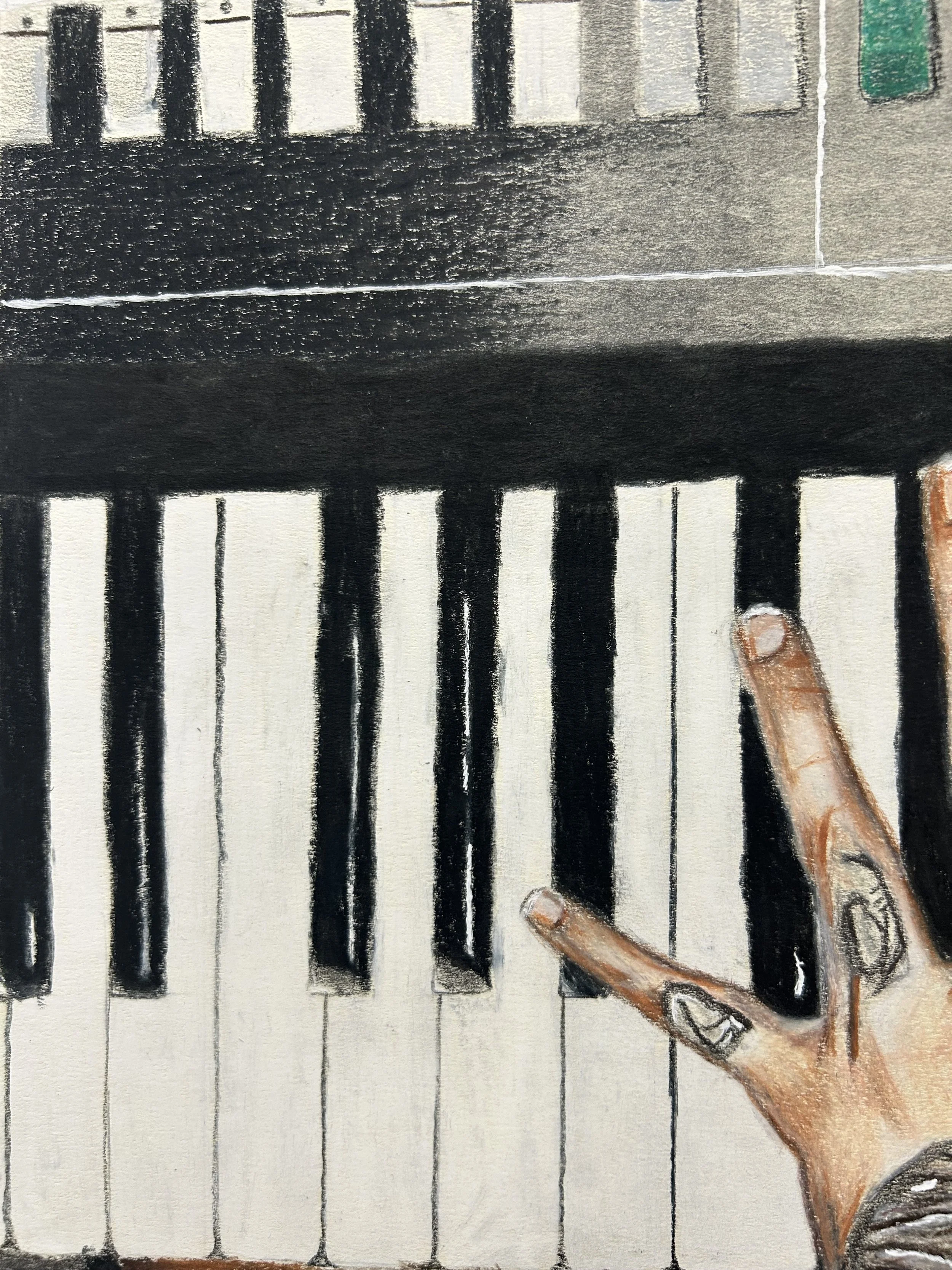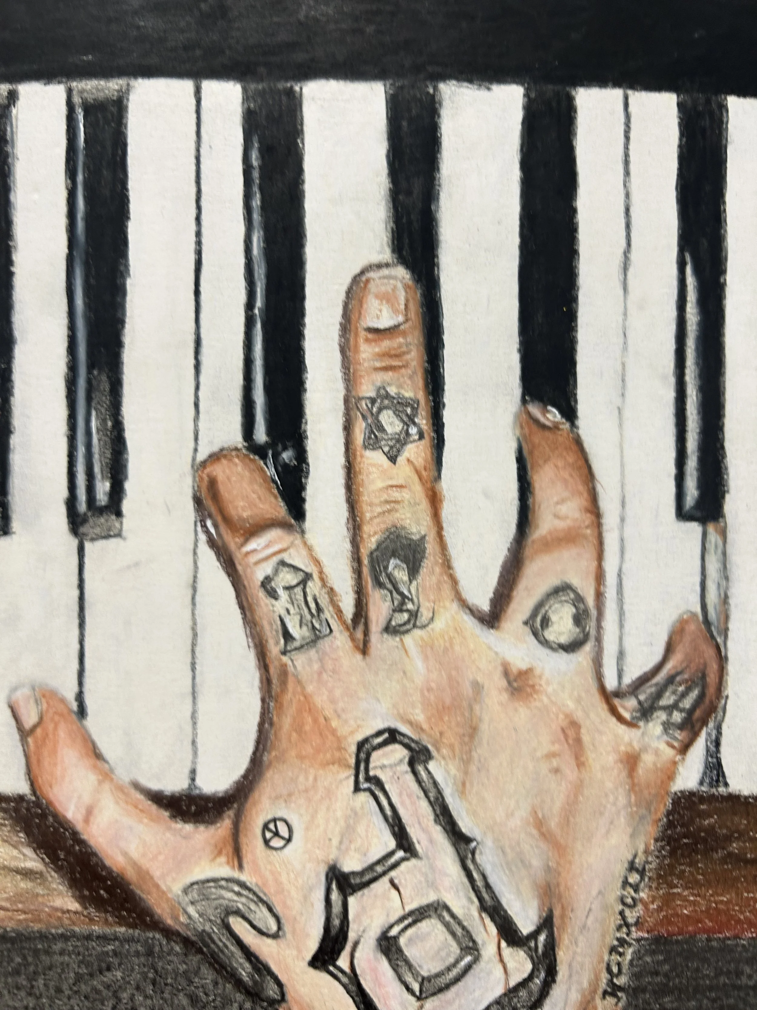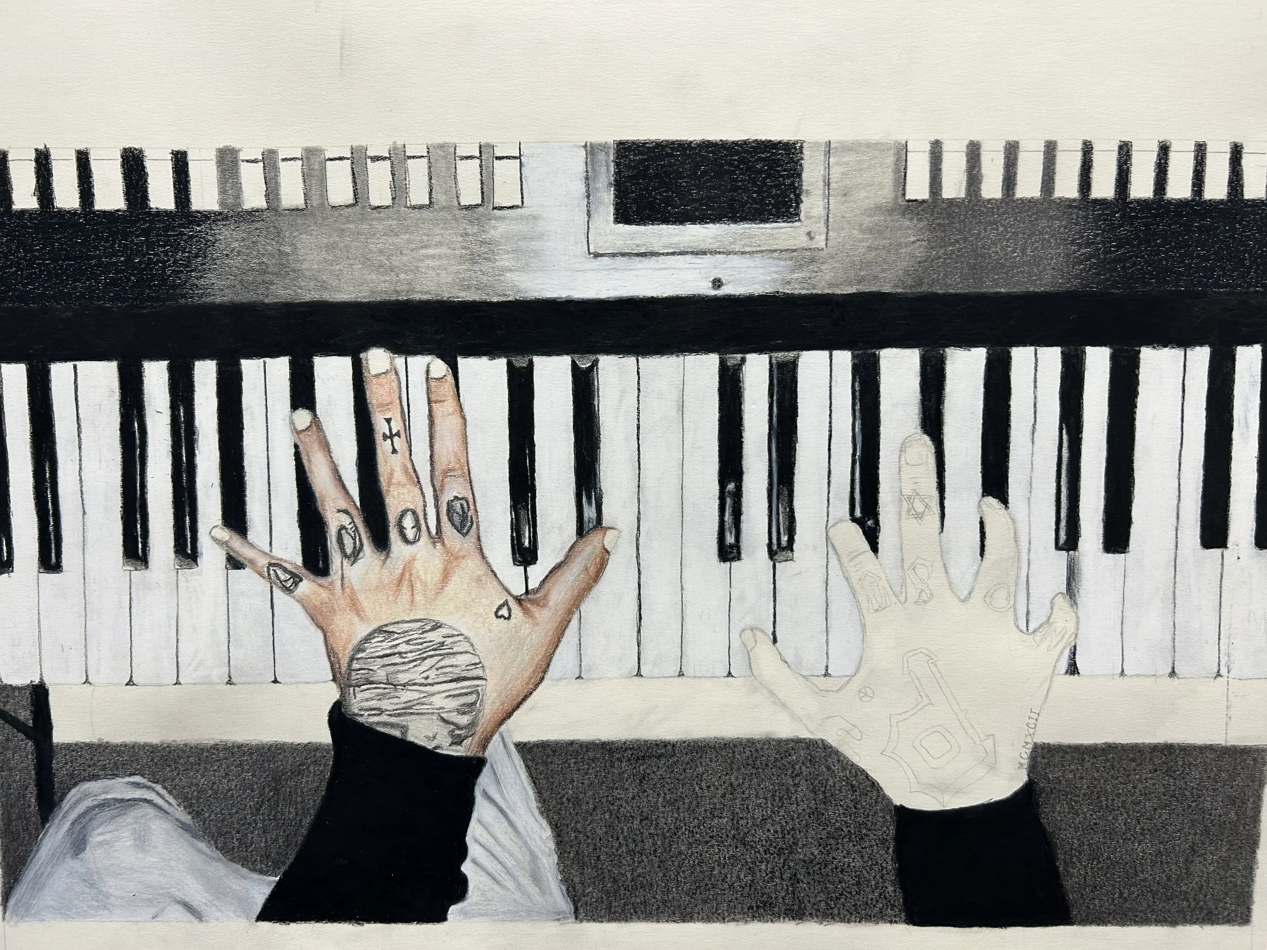 Hands- Mac Miller Trinity Falloncolored pencil & graphite22.5 in x 15.5 in2023 The tattoos on this piece are my favorite part of the artwork One hand to the next Audio behind the art